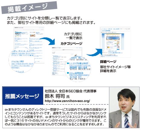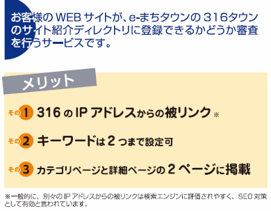 ご登録いただき、登録審査に合格すれば、本体サイトである「e-まちタウン」および、全国316の地域別タウンサイトのディレクトリに半永久的に掲載されます。この地域別の316タウンサイトは、それぞれが独立したIPアドレスを持つため、SEO効果の高い「IP分散被リンク」を効率よく獲得でき、Yahoo!JAPANやGoogleなどの検索エンジンの上位表示+アクセスアップを同時に期待できるカテゴリ登録のための審査サービスです。